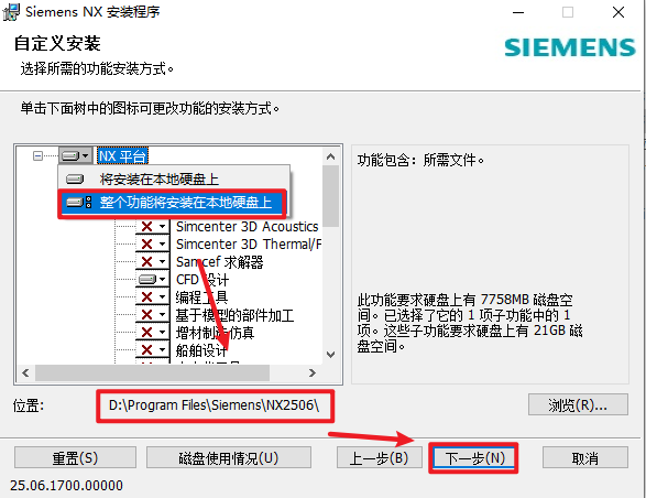 12.点击“NX平台倒三角展开符“,选择“整个功能将安装到本地硬盘上“,选择软件安装路径,安装路径不要出现中文,点击“下一步”