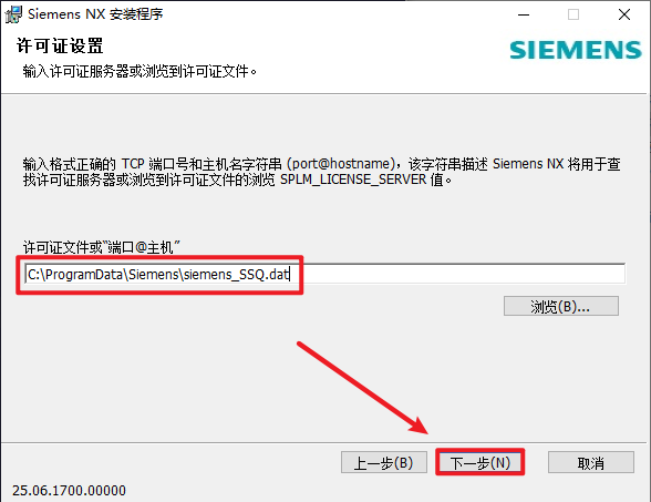 13.许可证文件或”端口@主机”确认填写:C:\ProgramData\Siemens\siemens_SSQ.dat,点击“下一步”