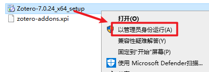 2.打开刚刚解压的文件夹,选中“Zotero-7.0.24_x64_setup”右键选择“以管理员身份运行”
