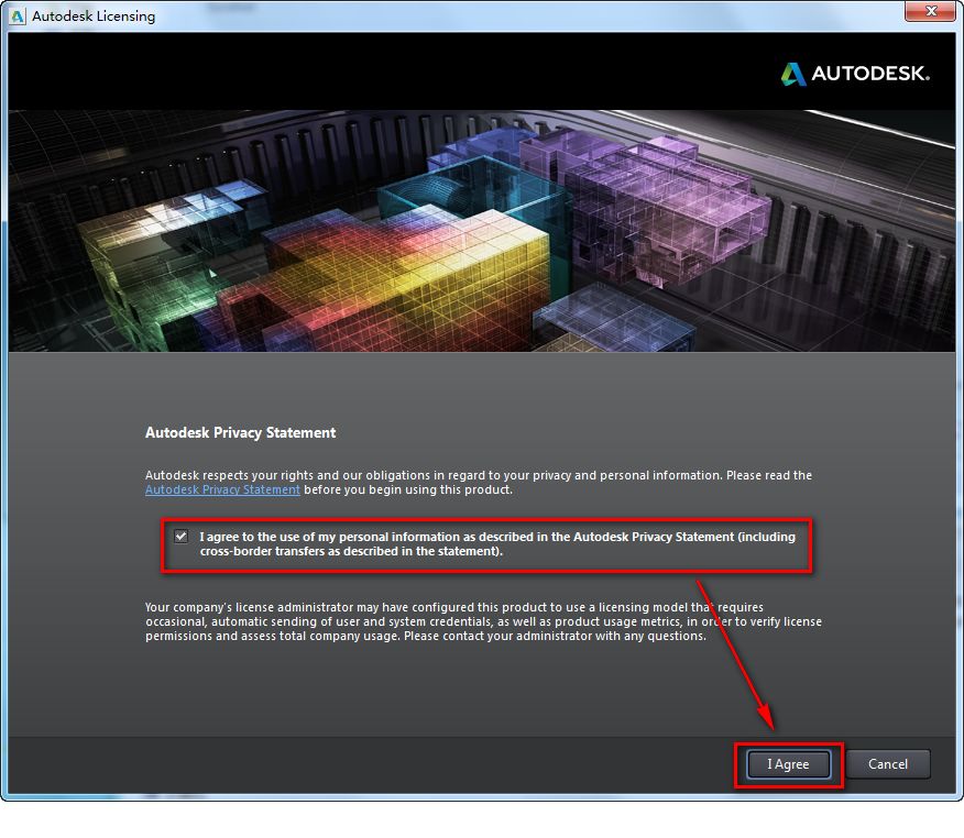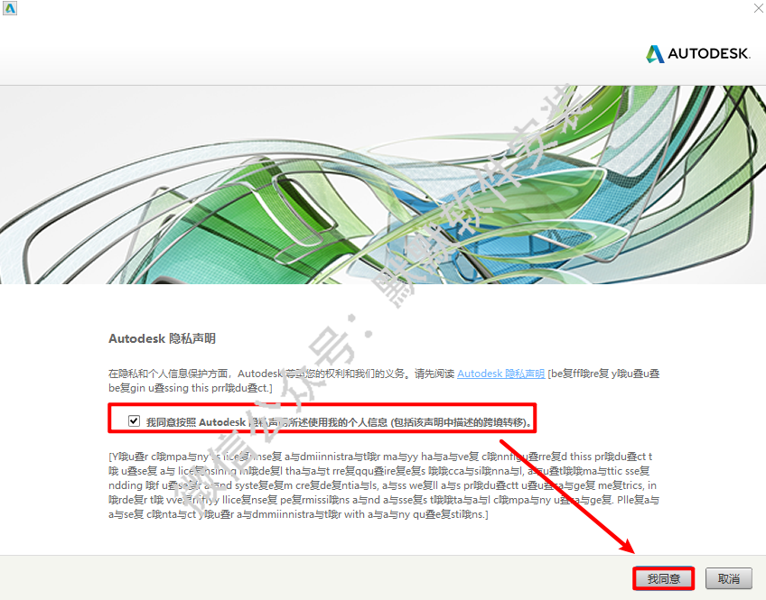 10.勾选我同意按照Autodesk隐私声明所述使用我的个人信息,点击“我同意”