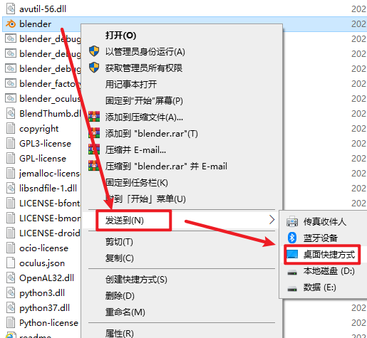 2.打开解压好的文件夹,再打开“blender2.83”文件夹,找到并选中“blender”,选择“发送到”,选择“桌面快捷方式”