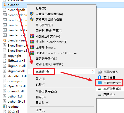 2.打开解压好的文件夹,再打开“blender-3.0.0”文件夹,找到并并选中“blender”,选择“发送到”,选择“桌面快捷方式”