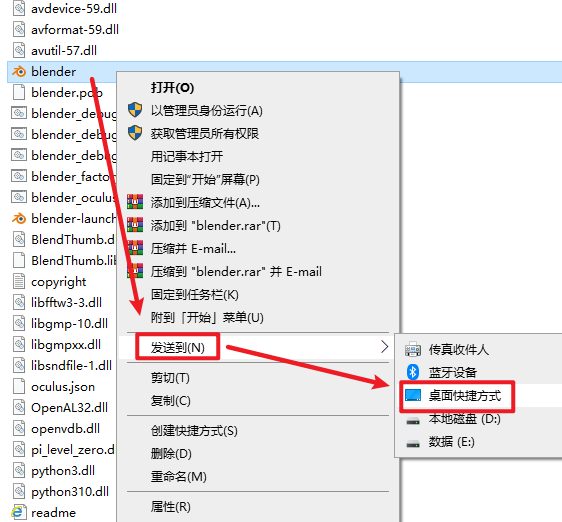 2.打开解压好的文件夹,再打开“blender-3.3.0”文件夹,找到并选中“blender”,选择“发送到”,选择“桌面快捷方式”