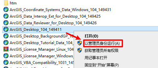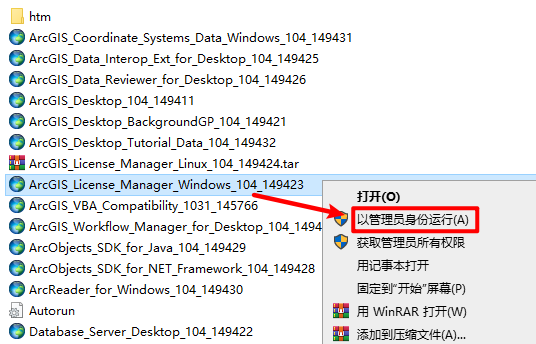 2.打开解压好的文件夹,双击打开“ArcGIS_Desktop10.4”文件夹,找到并选中“ArcGIS_License_Manager_Windows_104_149423”,右键选择“以管理员身份运行”