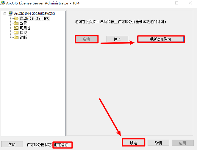 16..点击“启动/停止许可服务“,然后点击“启动“,显示“许可证服务器状态:正在运行“,点击“确定“