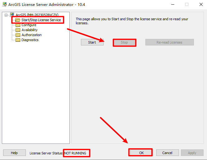 11.选择“Start/Stop License Service“,点击“Stop“,提示NO RUNING,点击“OK“