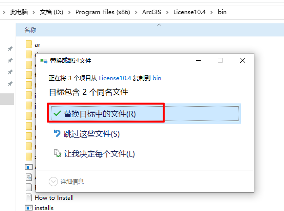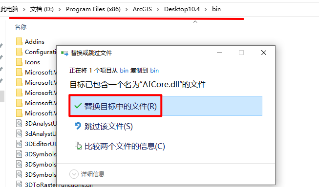 31.依次打开路径:D:Program Files (x86)ArcGISDesktop10.4bin,粘贴复制的文件到该路径下,并选择“替换目标中的文件”