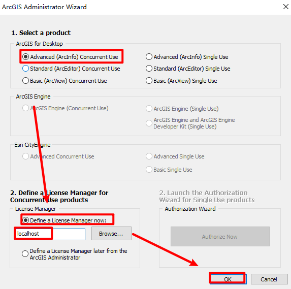 28.勾选“Advanced(Arclnfo)ConcurrentUse“,勾选“Define a License Manager now:“,输入:localhost,然后点击“ok“