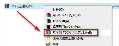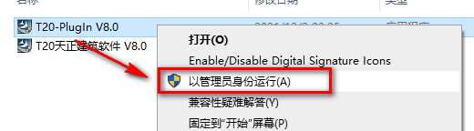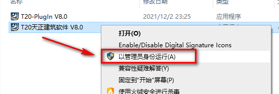 3.选中T20天正建筑V8.0,右键选择“以管理员身份运行”