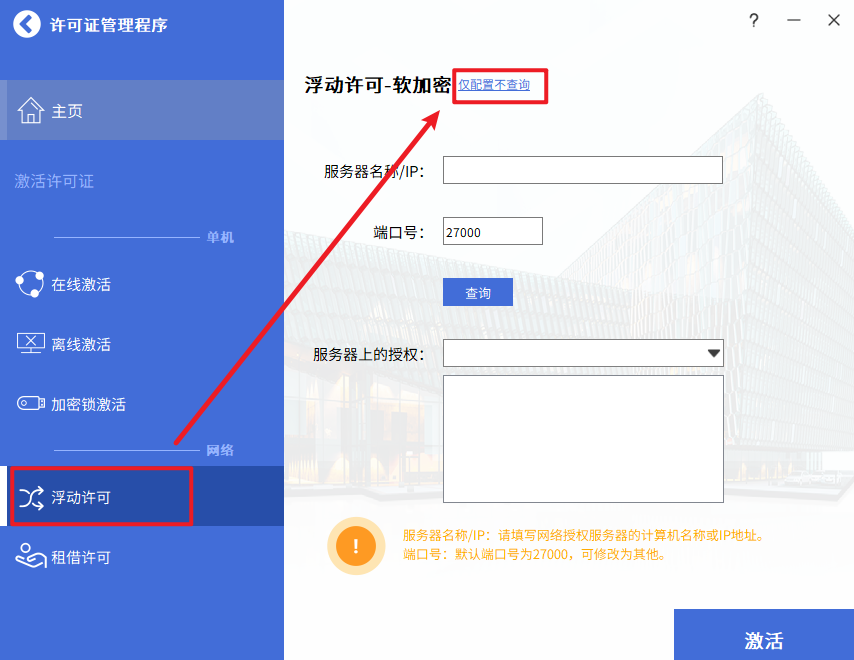 16.点击“浮动许可“,再点击“仅配置不查询“