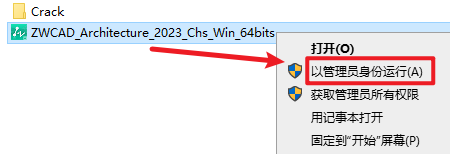 3.鼠标右键点击“ZWCAD_Architecture_2023_Chs_Win_64bits.exe”选择“以管理员身份运行”