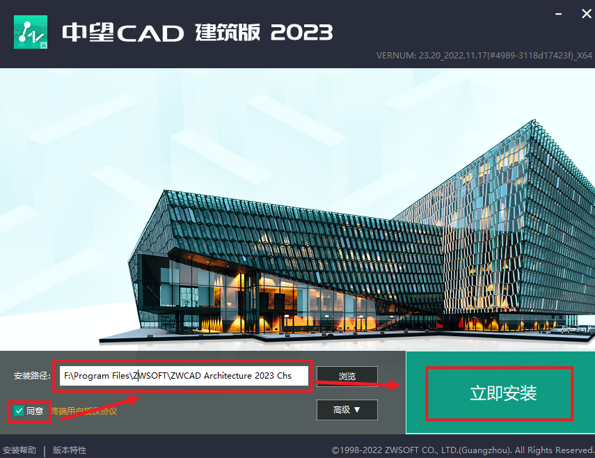 4.选择软件的安装路径,安装路径不要出现中文,勾选”同意终端用户授权协议”,点击”立即安装”