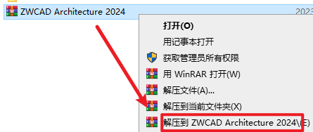 1.选中下载的安装包,然后鼠标右键选择“解压到 ZWCAD Architecture 2024”