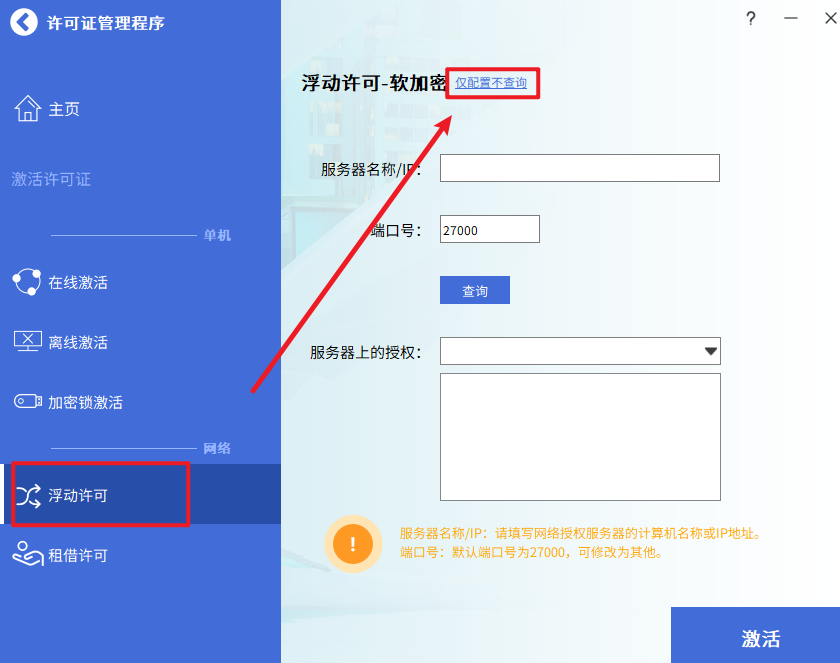 17.点击左侧“浮动许可“,点击“仅配置不查询“