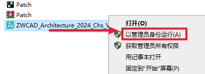 2.打开解压出的文件夹,鼠标选中“ZWCAD_Architecture_2024_Chs…”右键选择“以管理员身份运行”
