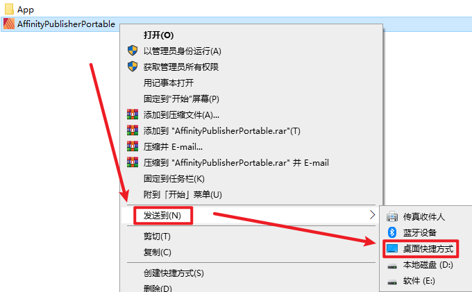 2.打开解压出的文件夹,选中“AffinityPublisherPortable.exe”选择“发送到”再选择“桌面快捷方式”