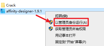 2.打开解压出的文件夹,选中“affinity-designer-1.9.1”右键选择“以管理员身份运行”