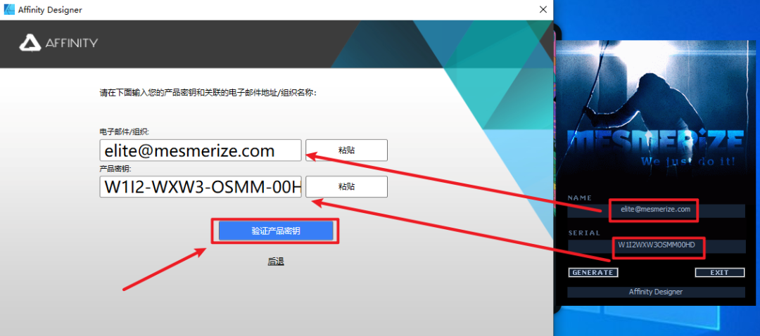 10.分别复制注册机中的“NAME“和“SERIAL“,粘贴至“电子邮件··“及“产品密钥“处,点击“验证产品密钥“