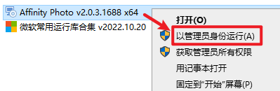 2.打开解压出的文件夹,选中“Affinity Photo v2.0.3.1688 x64”右键选择“以管理员身份运行”