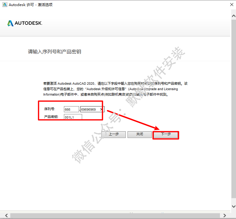 13.序列号输入:666-69696969,产品密钥输入:001L1,点击“下一步”