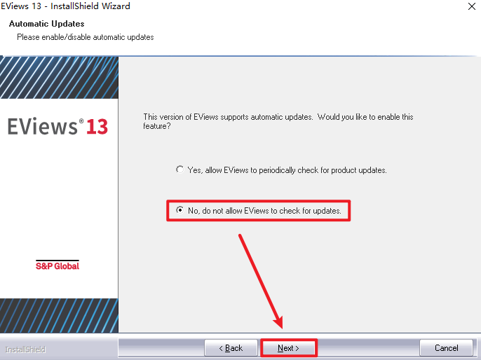 11.勾择No do not allow EViews to check for updates,点击“Next”