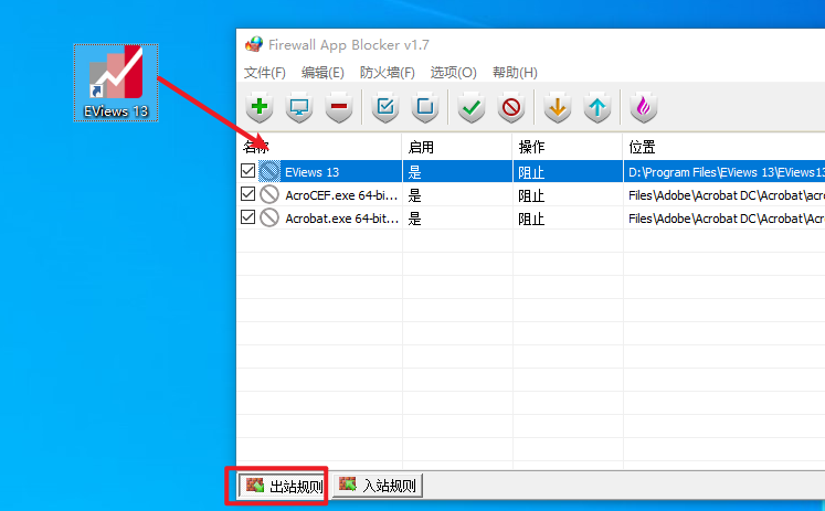 28.选择出站规则,将桌面上的EViews 13图标拖到软件界面内