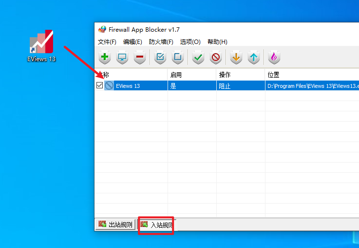 29.选择入站规则,将桌面上的EViews 13图标拖到软件界面内