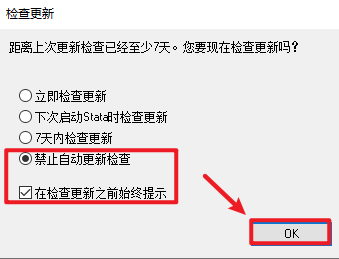 17.勾选“禁止自动更新“,取消勾选“在检查更新之前始终提示“,点击“OK“