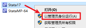 2.打开解压好的文件夹,选中“Stata17.exe”右键选择“以管理员身份运行”