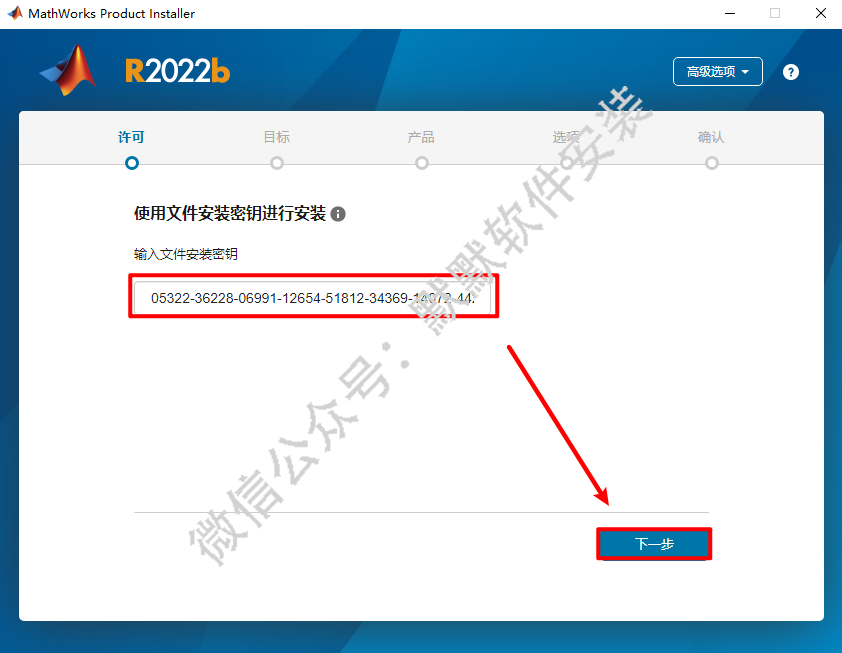 6.在输入文件安装密钥输入:05322-36228-06991-12654-51812-34369-14072-44298-22786-36732-05503-35033-50900-29808-05166-12170-05630-02560-02687-62114-45079-42917-06281-13007-19512-18270,点“下一步”