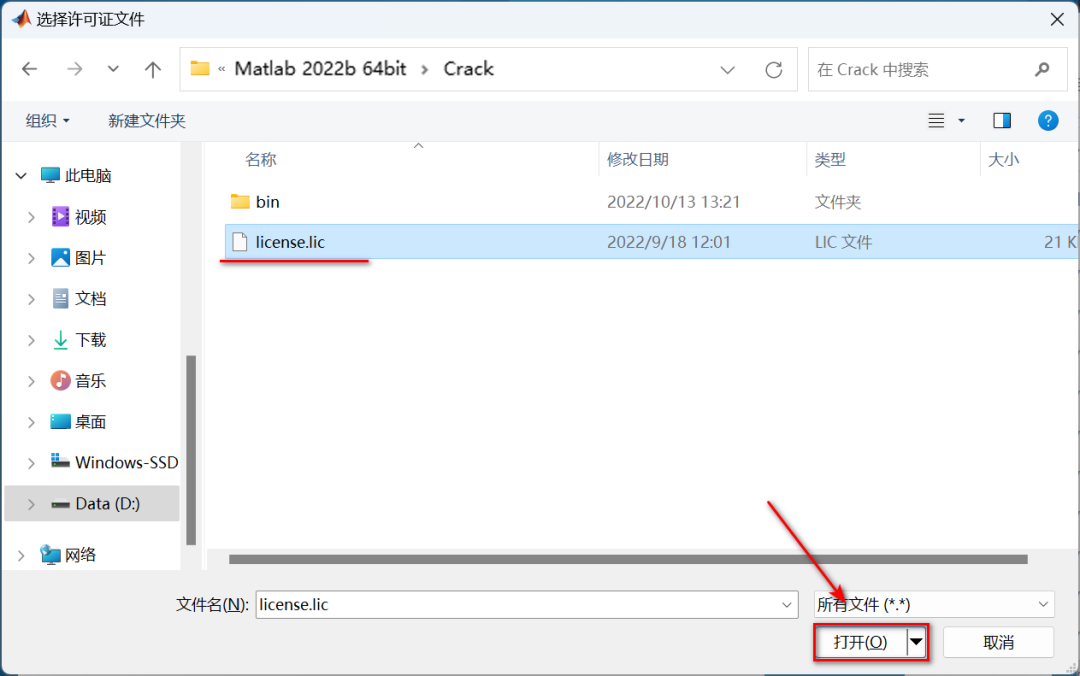 8.在解压后的文件夹Matlab 2022b文件夹中的【Crack】文件夹,选中license.lic文件,点“打开”