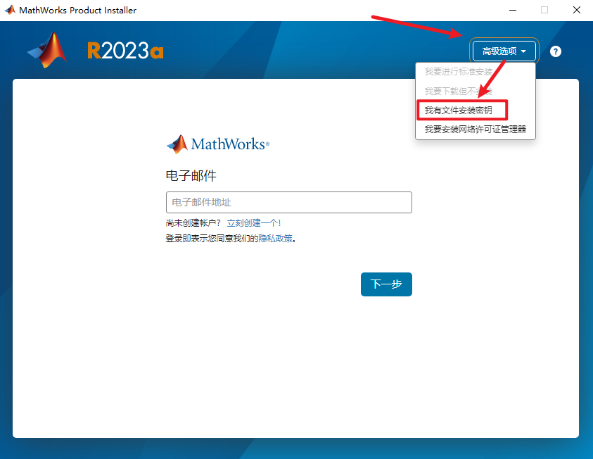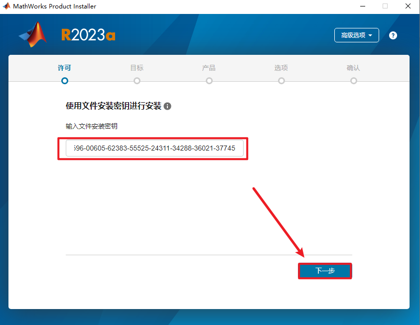 6.在输入文件安装密钥输入:17704-65516-28949-05196-27677-58153-52675-25427-40932-65107-12325-01750-10518-09536-46547-49184-48288-09956-47596-00605-62383-55525-24311-34288-36021-37745,点击“下一步”