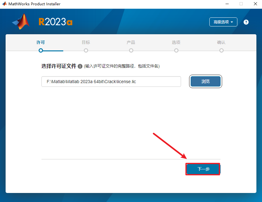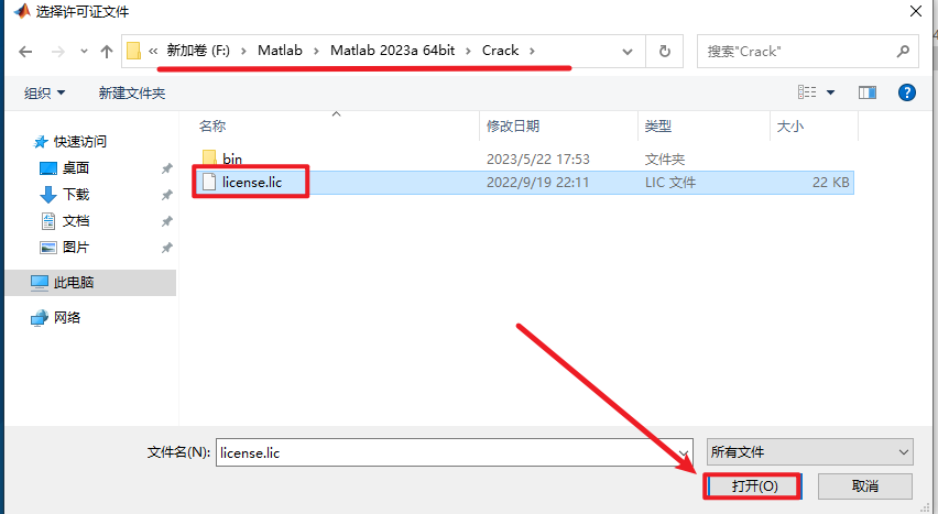 8.在解压后的文件夹Matlab 2023a文件夹中的【Crack】文件夹,选中license.lic文件,点击“打开”