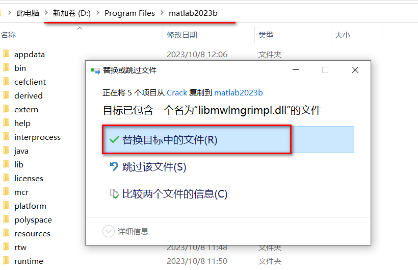 18.将bin文件夹粘贴到软件安装路径下(第10步设置的路径),点击“替换目标中的文件”