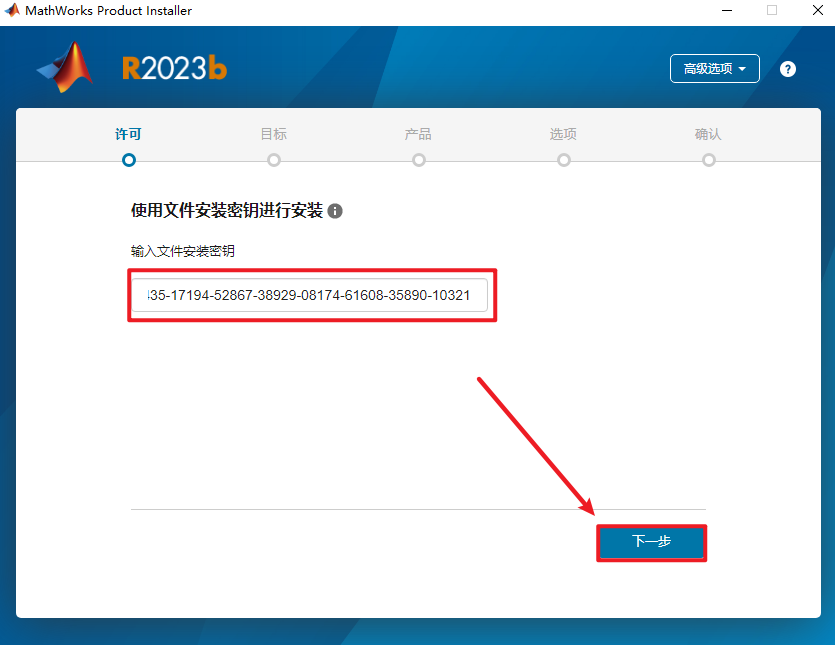 6.在输入文件安装密钥输入:19888-45209-61323-29230-25497-43412-35108-15123-25580-54377-05875-31006-25681-45018-46907-09460-23253-25339-58435-17194-52867-38929-08174-61608-35890-10321,点击“下一步”