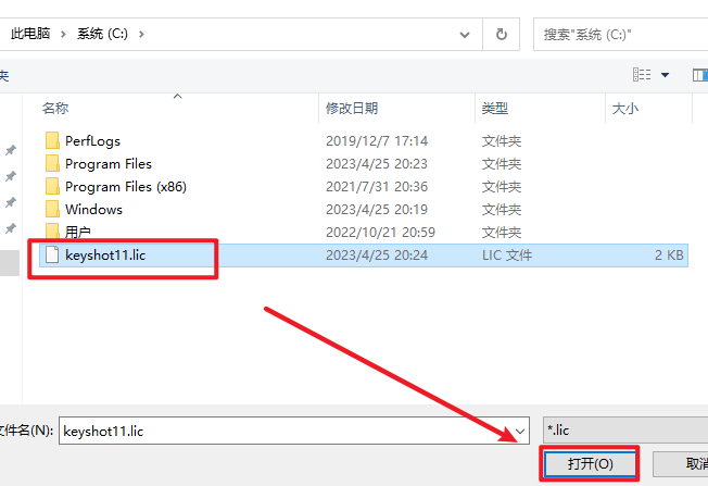 22.选择C盘下的刚才保存的”keyshot11.lic“文件,点击“打开”
