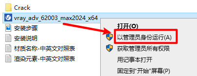 2.打开解压好的文件夹,选中“vray_adv_62003_max2024_x64.exe”右键选择“以管理员身份运行”