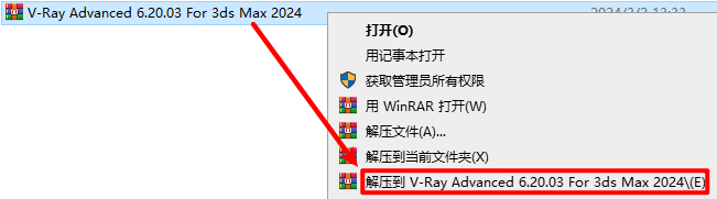 1.选中下载的压缩包,右键选择解压到“vra-y for 3ds Max2024”