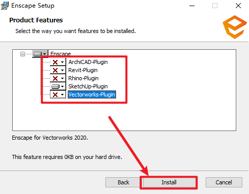 8、我们以Enscape安装到SketchUp上举例,删除SketchUp-Plugin以外的其他平台都选择X,只选择“SketchUp-Plugin”,然后点击“Install”