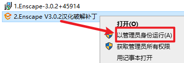 11、返回安装文件夹,选中 “2.Enscape V3.0.2汉化破解补丁”,右键选择“以管理员身份运行”