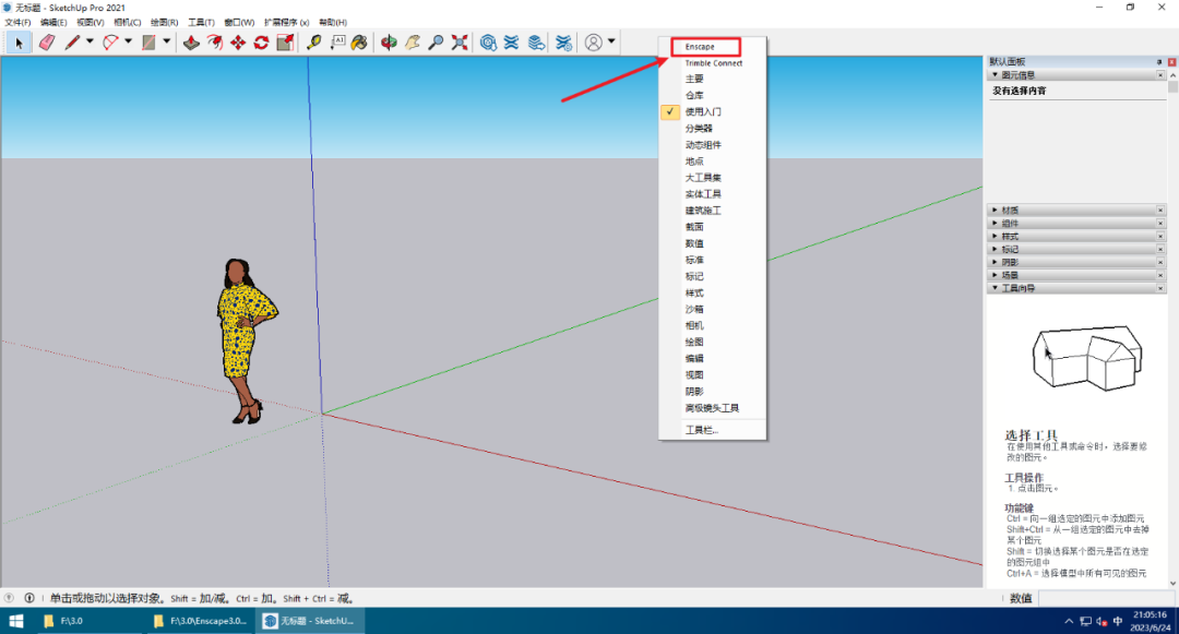 15、如果在软件界面没有Enscape工具栏,则在上方工具栏右侧空白处,鼠标右键,选择Enscape,调出Enscape工具栏