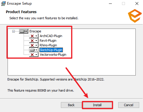 8、这里以Enscape安装到SketchUp上为例子,所以将除了SketchUp-Plugin的其他平台都选择X,只选中SketchUp-Plugin,然后点击“Install”