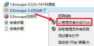 11、返回安装文件夹,选中“ 2.Enscape 3.3汉化补丁”,右键选择“以管理员身份运行”