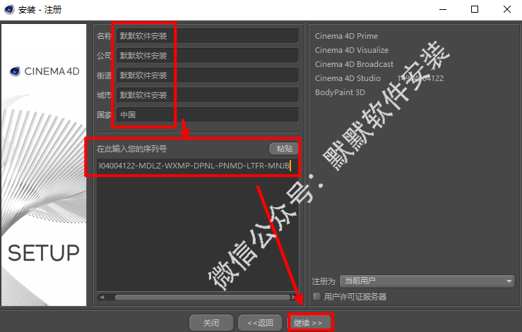 6.序列号输入14904004122-MDLZ-WXMP-DPNL-PNMD-LTFR-MNJB,点击“继续”