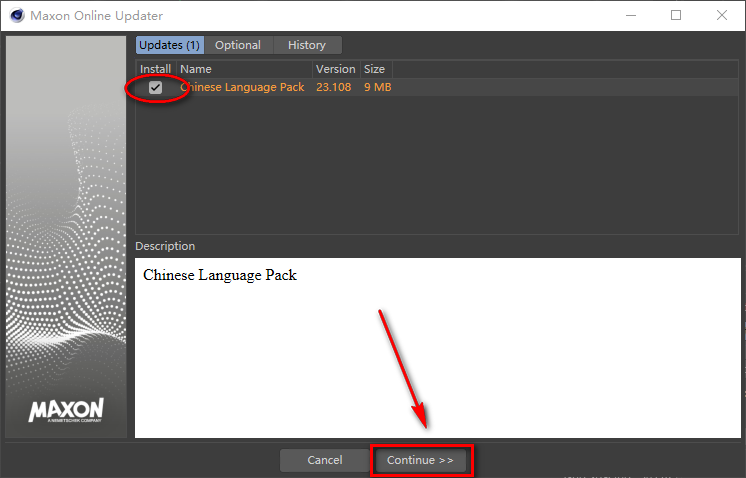 20.将Chinese_23107_20201102.c4dupdate文件,拖拽到C4D软件中