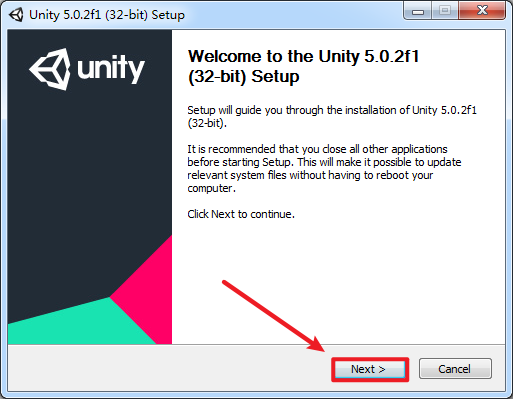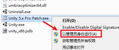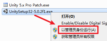 2.打开解压好的文件夹,选中“UnitySetup32-5.0.2f1”安装程序,右键选择“以管理员身份运行”
