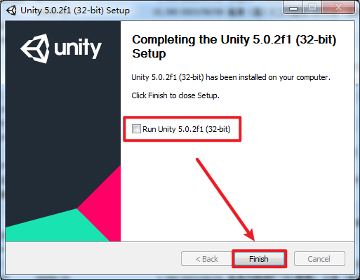 8.取消勾选“Run Unity 5.0.2f1”,点击“Finish”