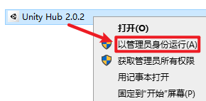 10.选中“Unity Hub 2.0.2”安装程序,右键选择“以管理员身份运行”