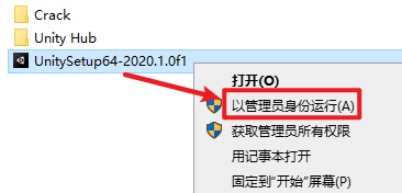 2.打开安装文件夹,选中“UnitySetup64-2020.1.0f1”安装程序,右键选择“以管理员身份运行”