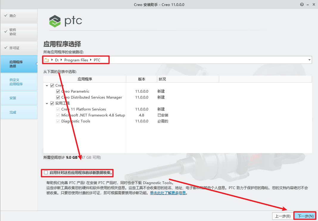 16.修改安装位置路径中的首字符C可更改安装位置,本例安装到D盘,取消勾选【…诊断数据收集】,然后点击下一步